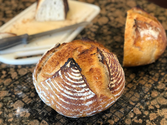 Baking bread, particularly sourdough, has become my new hobby. I started a sourdough starter back in November, just to see if I could do it. It worked and these little round beauties have been on my counter weekly ever since. It's especially delicious toasted with raspberry jam.